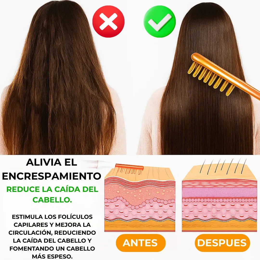 El peine de Alta Frecuencia no solo frena la caída y controla el frizz, sino que despierta cada folículo con microcorrientes que mejoran la circulación.